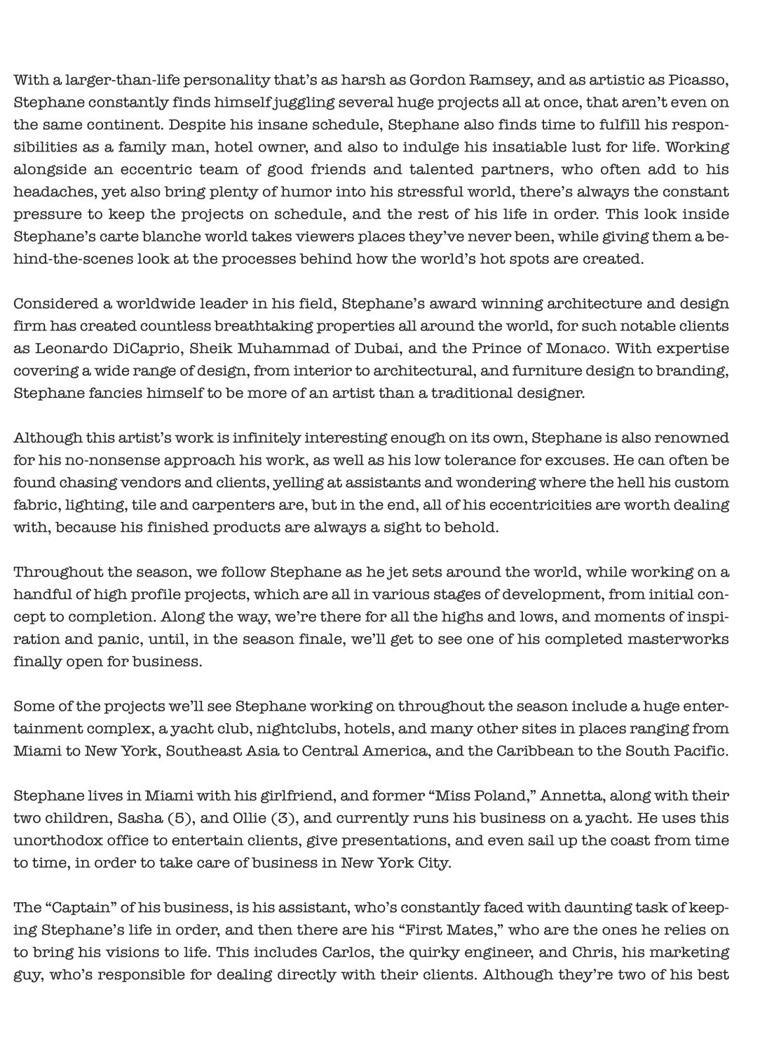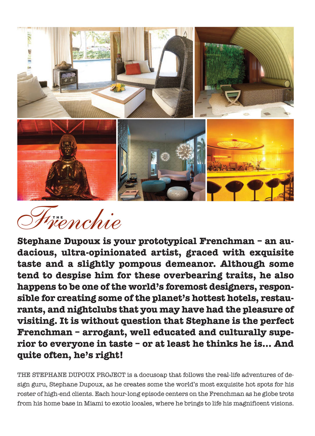 A bold, charismatic portrait of Stephane Dupoux—visionary designer and unapologetic Frenchman. Known for his sharp opinions and refined taste, Dupoux brings wit, flair, and undeniable talent to the world of luxury hospitality design. Love him or not, he usually gets it right.